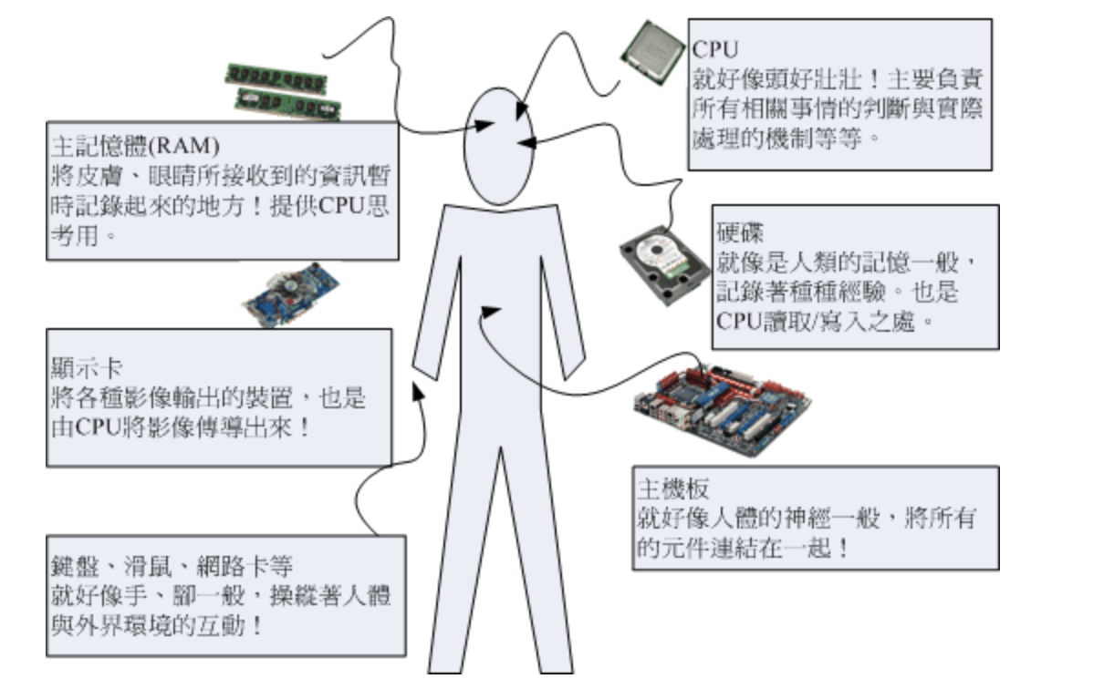 如果不是很了解电脑的运作流程的话,超哥拿个简单的想法来思考好了~假设电脑是一个人体,那么每个元件对应到那个地方呢?可以这样思考: