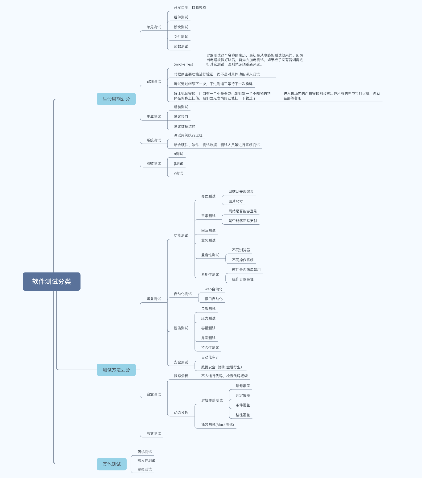| 测试依据 | 代码、注释、详细设计文档 | 冒烟测试用例 | 单元测试模块、概要设计文档 | 需求说明文档、测试用例 | 用户需求、验收标准文档 |