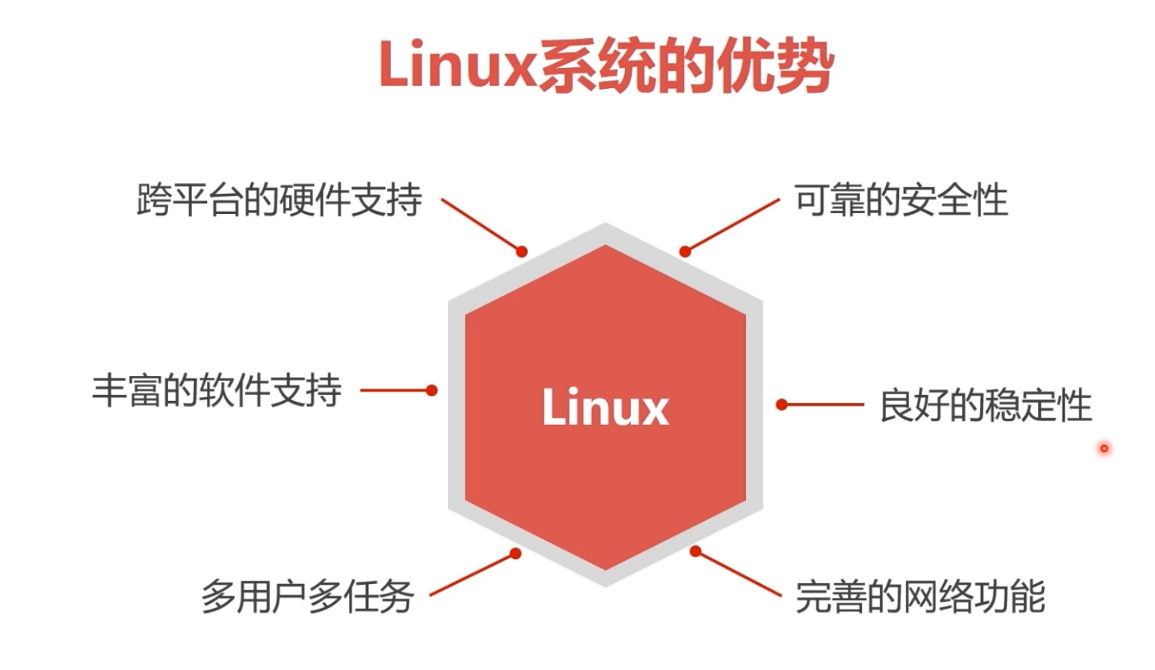 Linux以高效和灵活主城,Linux同事具有多任务、多用户的能力,支持多线程,多CPU。 Linux包括了文本编辑器,高级语言编译器,以及图形用户界面登应用软件,当然绝大多数服务器都是使用命令行,文本模式操作Linux的。 Linux遵循GNU通用公共许可协议,属于自由软件,用户不需要支付费用就可以获得系统和系统源代码,无偿使用且自由传播。 Linux具有很高的系统稳定性和可靠性。 具有很高的系统安全性 众多业界厂商支持,如IBM、Oracle、Intel、HP、Google等 有完善的数据库平台,包括Oracle、DB/2、Sybase、MySQL、PostgreSQL等。 有完善的图形化用户界面,包括GNOME、KDE等。 有完善的开发平台,包括C/C++、Java、Python等。