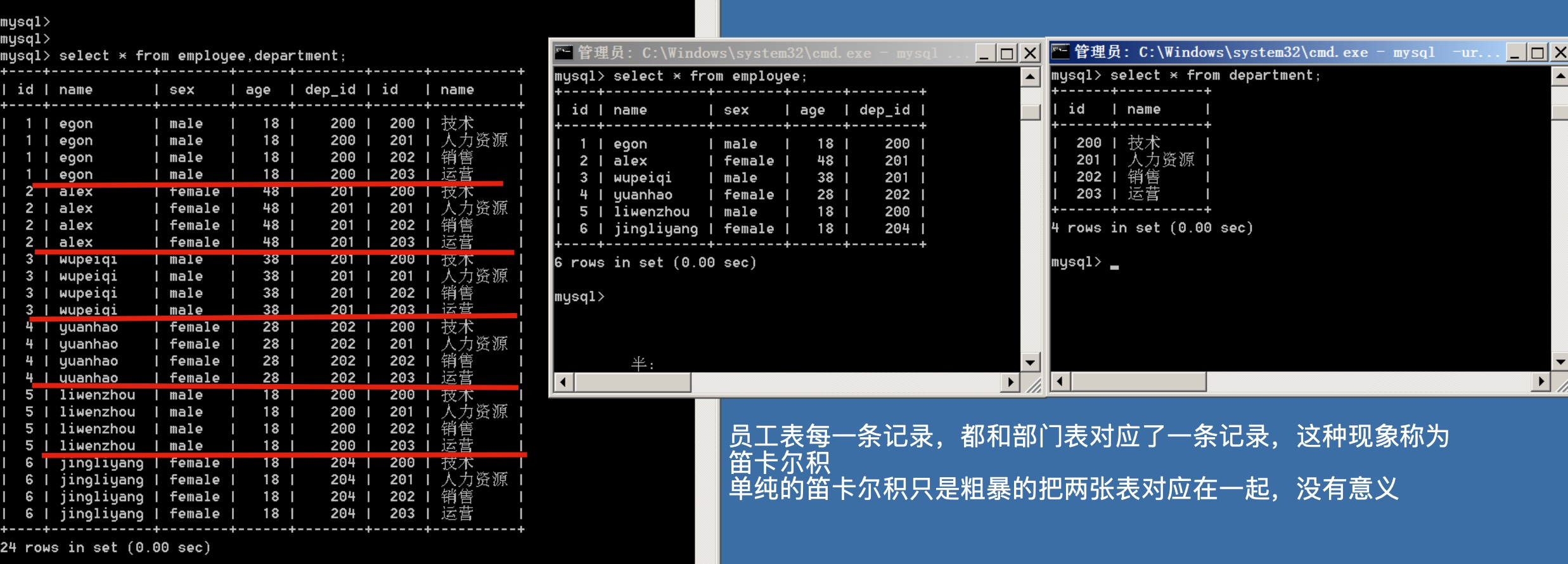 左表每一条记录都和右表对应了一条记录,称为笛卡尔积,单纯的笛卡尔积没有意义,简单粗暴的把两张表对应在一起。
