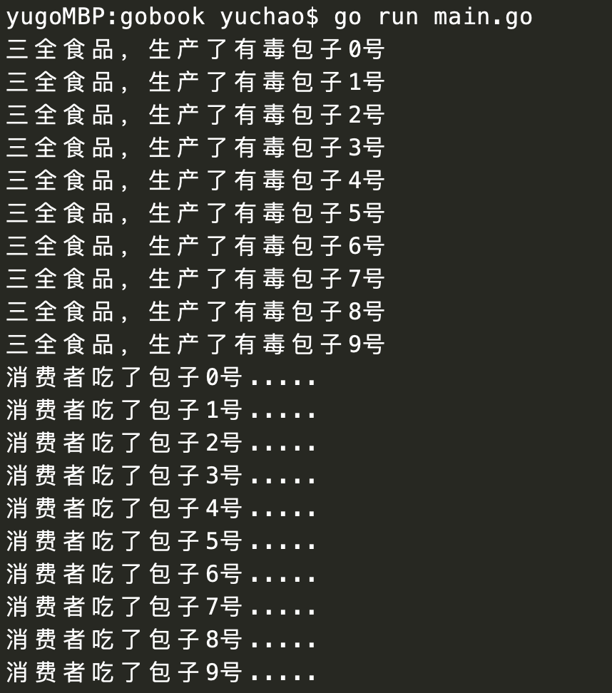 fmt.Printf("消费者吃了包子%d号.....\n", baozi)